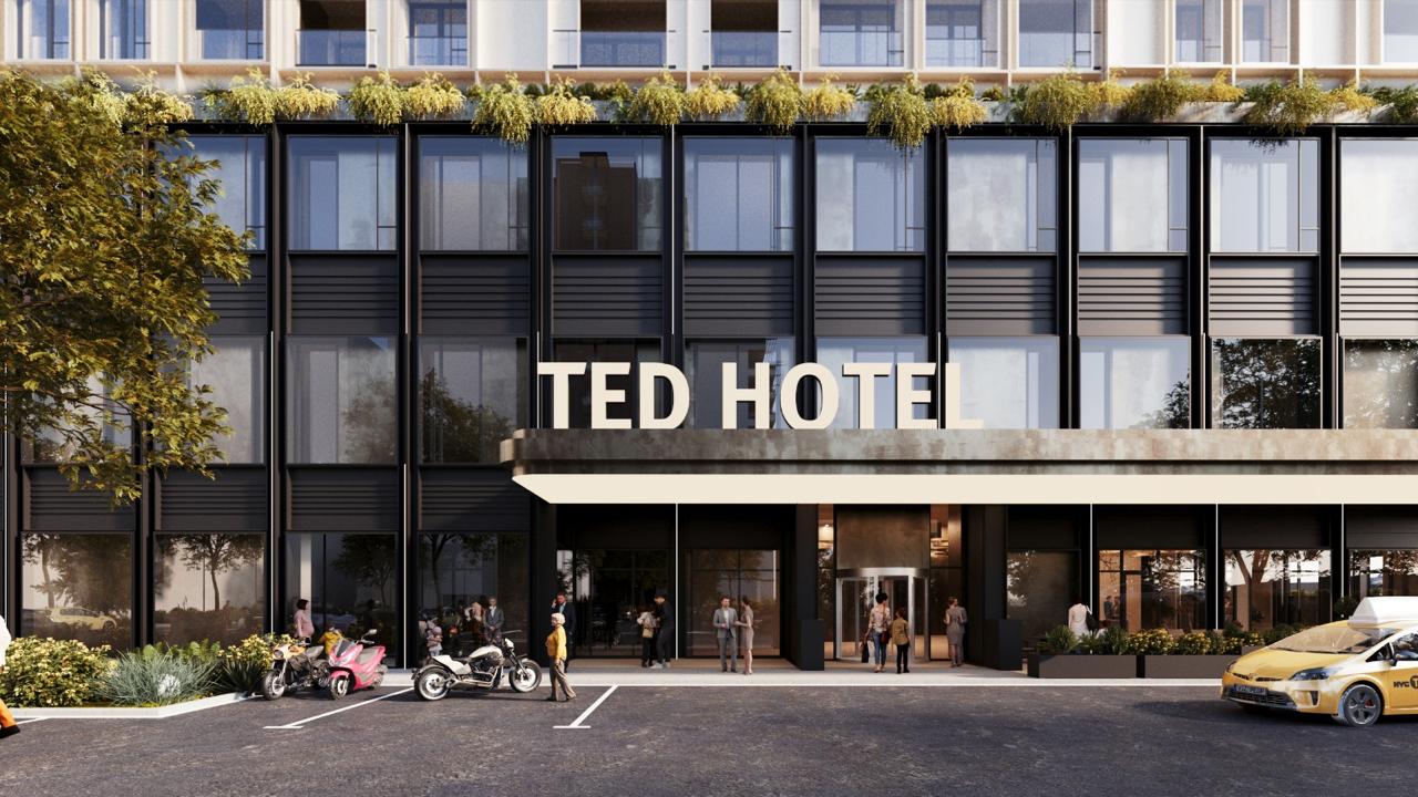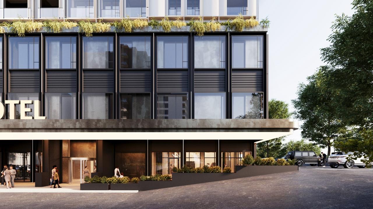A dark-glass pavilion on a quiet block. Ground floor open to the street, three floors of guest rooms above.