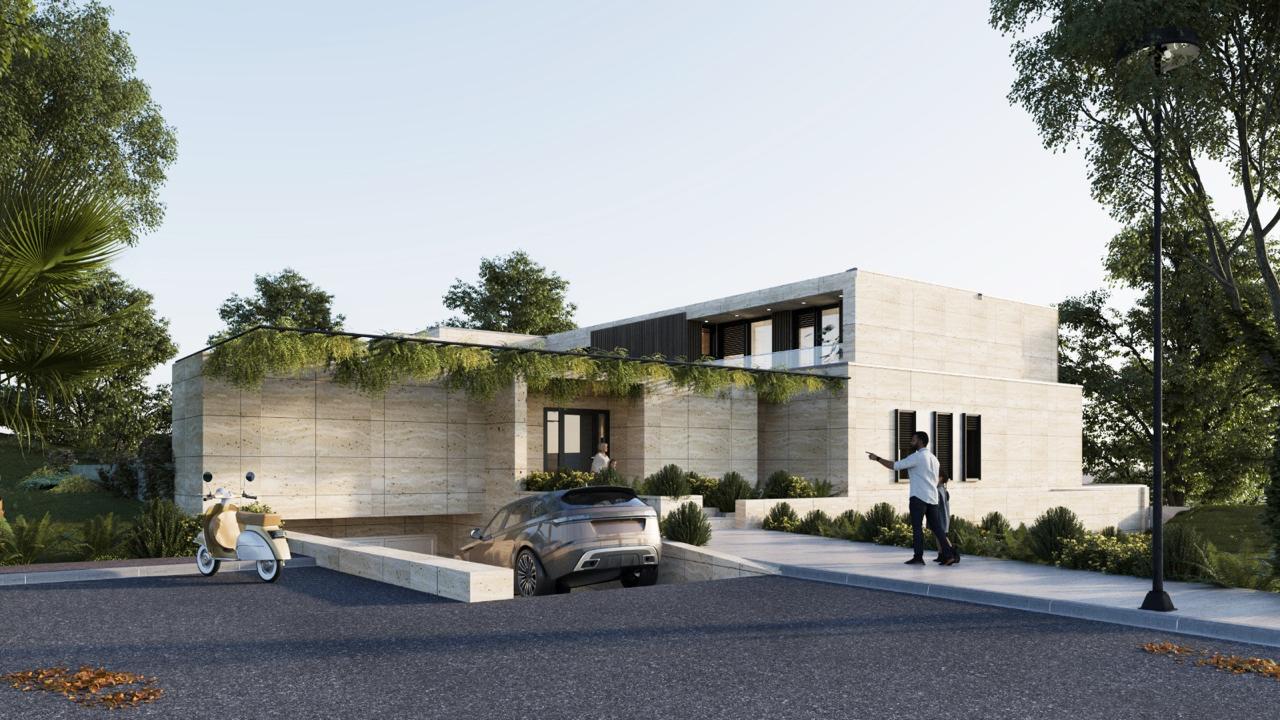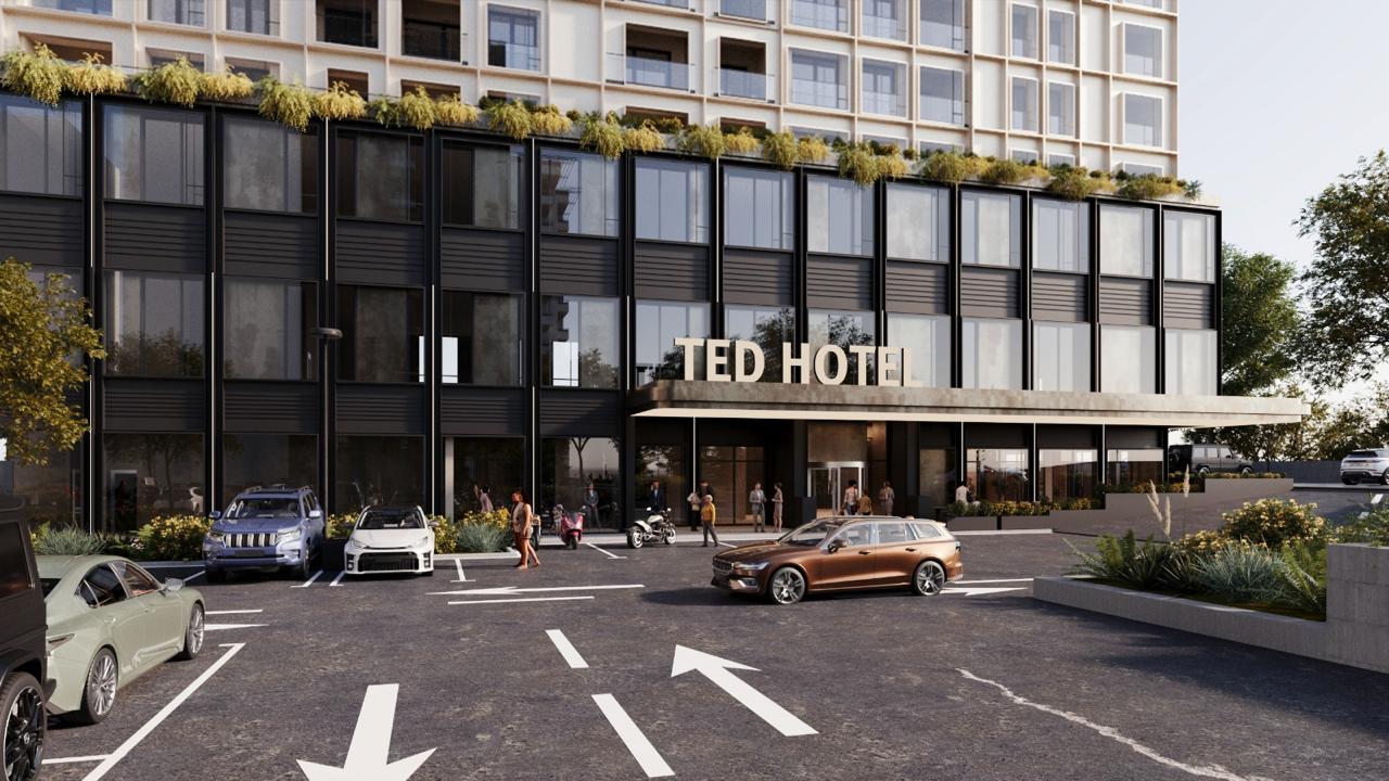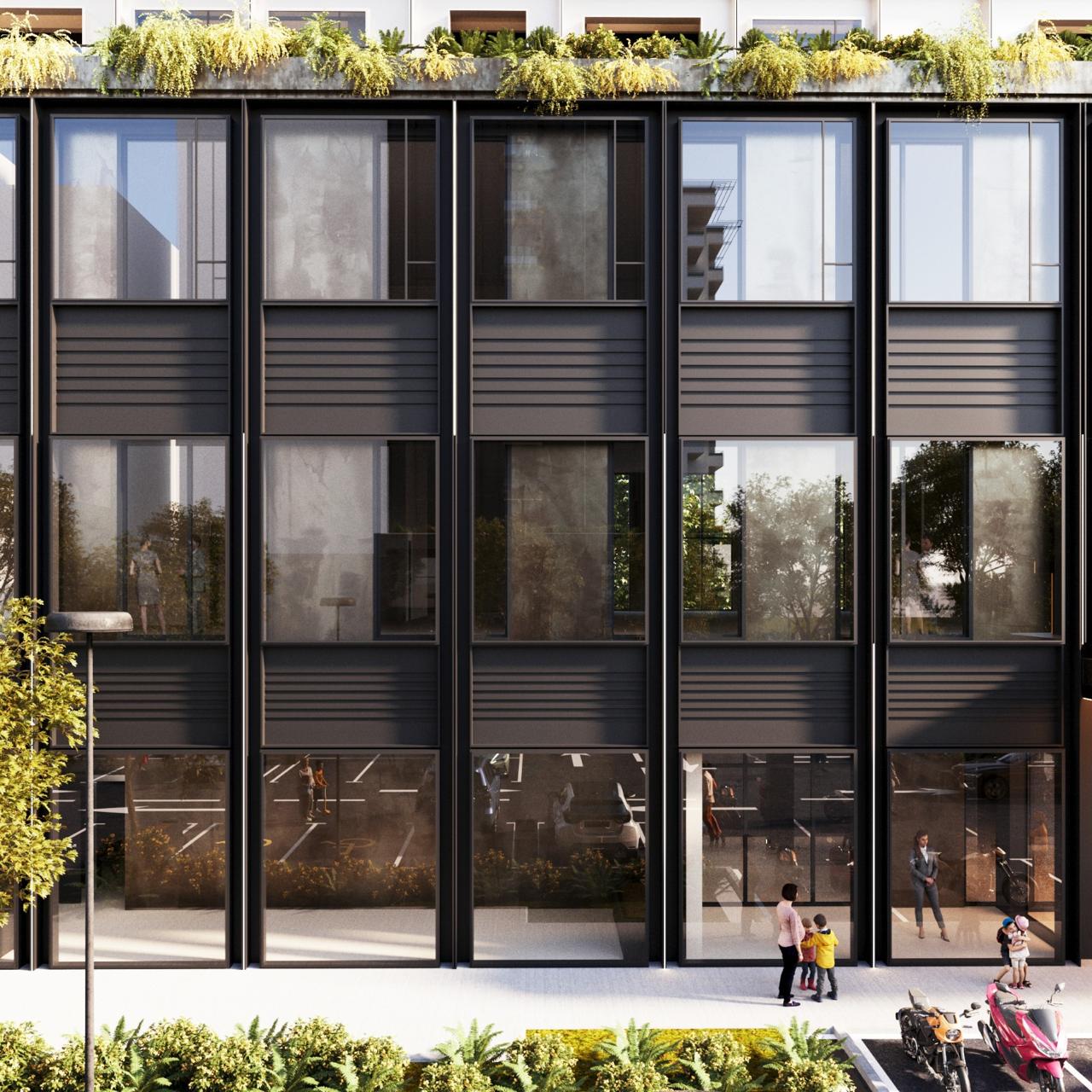 A small hotel and gallery hybrid. The facade is a single detail repeated: a deep aluminium reveal around each bay, set against matt black glass. At street level the envelope lifts to form a covered forecourt.