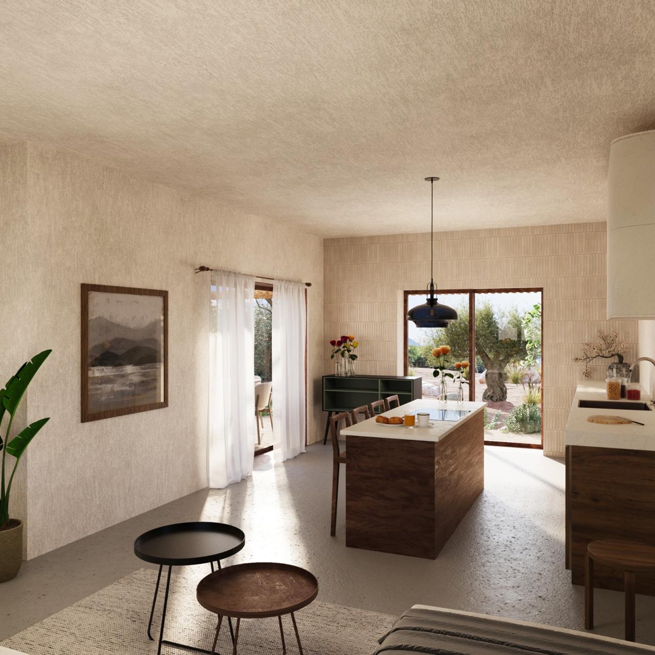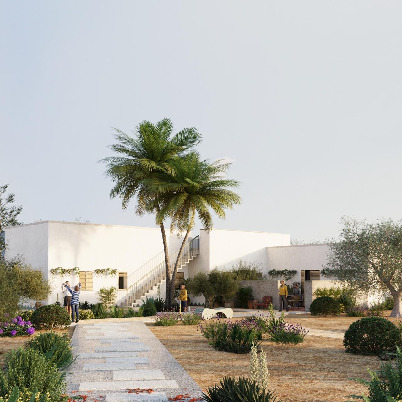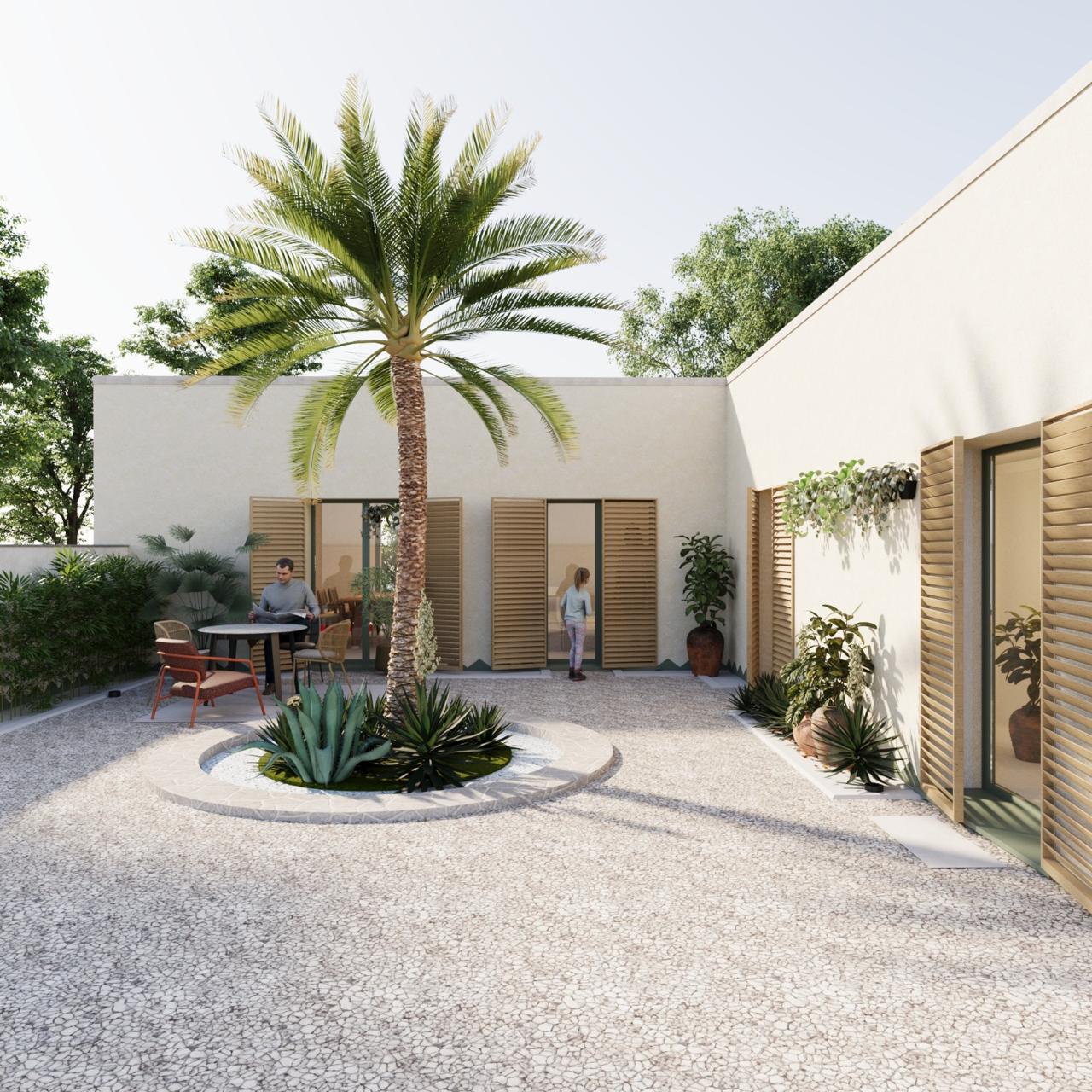 A continuous ochre facade, articulated by tall shuttered openings and a pitched parapet that unifies the seven units. Each house reads as part of a single long building, not a repeated object.