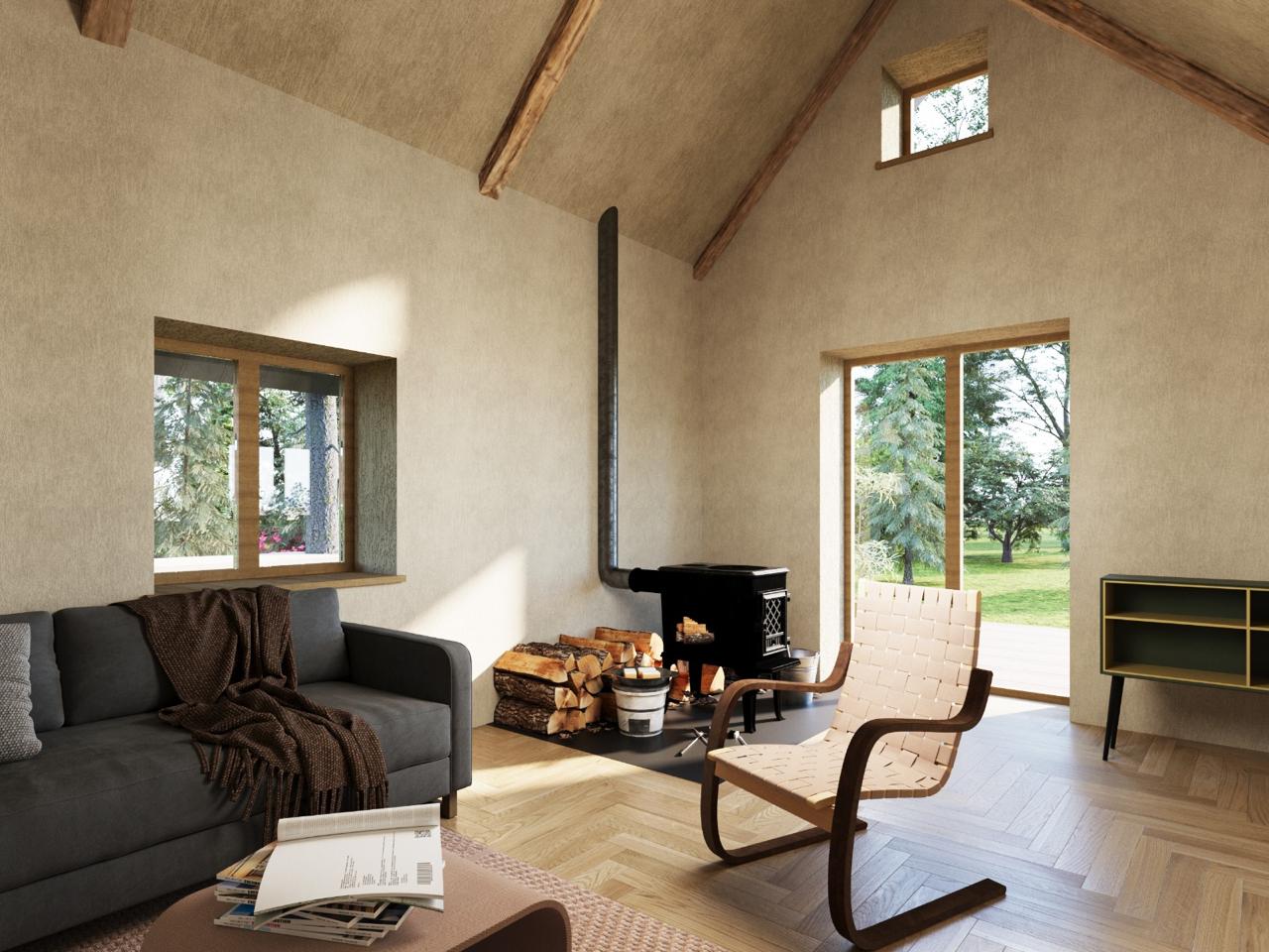 The plan is deep and narrow, with a courtyard at the rear and a double-height living space at the front. Materials are plain: terracotta render, oak joinery, stone floors.