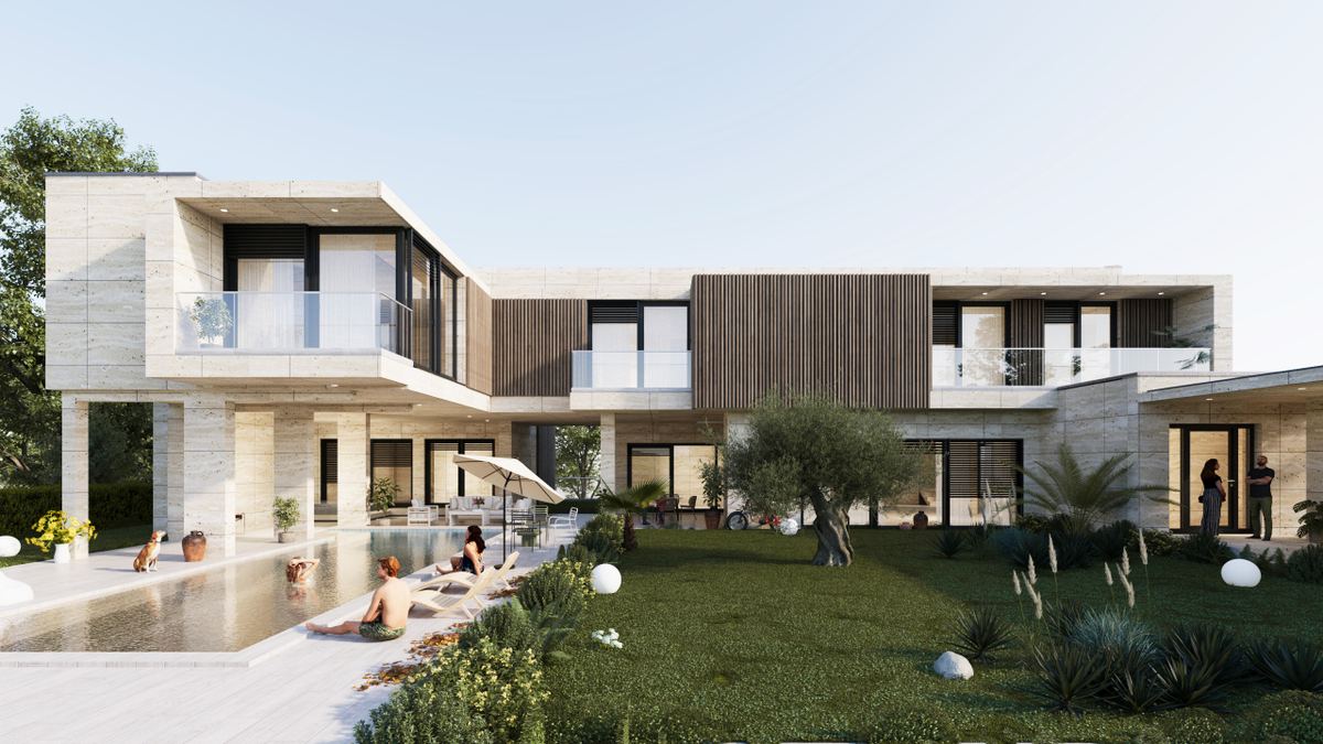 A modern villa composed of horizontal stone volumes, where the architecture is organised around a central courtyard with a pool. The use of natural stone, vertical wooden screens, and deep terraces creates a balance between openness and privacy, responding to both climate and lifestyle. Outdoor living is treated as an extension of the house, with shaded areas, soft landscaping, and a calm, Mediterranean-inspired atmosphere adapted to the local context.